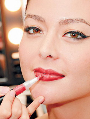 第二步,由唇部中央位置慢慢推开唇彩。