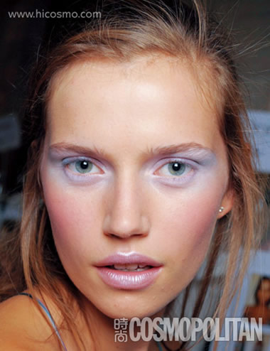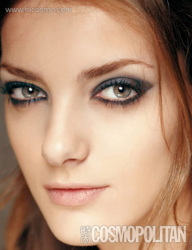 灰色烟熏妆很诱人,窍门是先用含闪光成分的沙土色或奶白色的眼影轻扫整个眼睑,这样一方面可以防止眼皮出油弄花眼妆,一方面提亮整个眼窝让烟熏更自然。之后用深灰色的眼影沿着睫毛根部浓浓地描绘一层,再用棉棒晕染开。