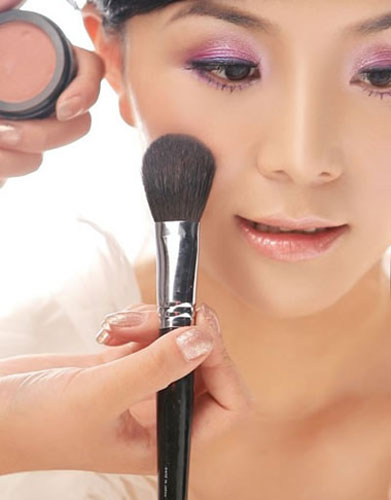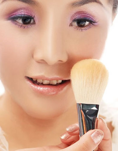 2、选用较深色的定妆散粉用刷子扫与面部定妆。