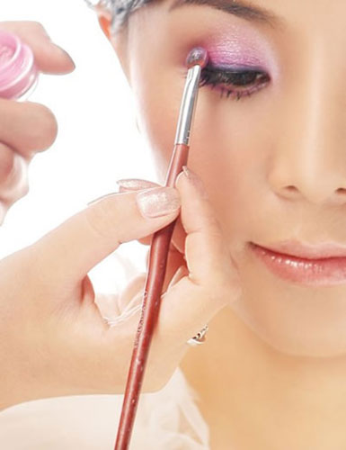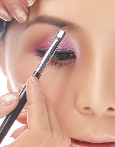 4、粉紫色的珠光眼影用 刷子过度的匀染整个眼睑。