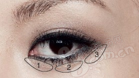 泪袋不同于眼袋,它是紧贴着下眼线的位置,在泪袋上涂上一点珠光眼影,眼神就会变得闪闪动人。