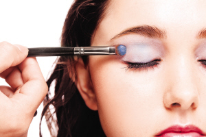 2 先用手指印上彩蓝色的防水眼影,然后用扫扫匀在眼窝正中央突出的位置。