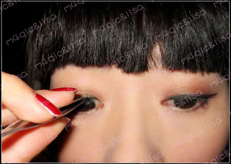 然后上胶水通常人的内眼角是没什么睫毛生长的,所以贴的时候要在前面留出一部分空隙,这样才自然,哈哈!
