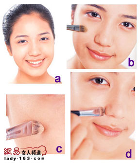 Make Up Point 用粉底刷代替会更好 粉底刷不像手指有弧度,所以用粉底刷刷粉底液会比用指腹来得均匀,刷得方法其实差不多,但有几点还是需要注意。 刷子绝对禁止直立 直立拿粉底刷刷脸,一定会将底妆搞得坑坑洞洞,所以觉得不能直立刷 如何选择粉底刷? 尼龙毛材质有弹性,可以将粉底液跟毛刷彻底吸收一起,最适合刷在脸上 如何用粉底刷? 刷子要平贴肌肤,而且还要顺五官形状刷下,粉丝才会完全附着在肌肤上 鼻翼要立起来刷 鼻翼是最不好刷得部位,如果数字平刷就会刷不匀,立起来才能将粉底液刷干净