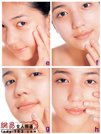 [Step 2] 浅色粉底液在脸上推开(下) e.推匀眼下多余粉底 成放射状推匀多余粉底,消除周围界限 f.推开下巴粉底 从嘴角往下巴处将粉底液按压推开,让嘴唇更翘 g.推匀下巴多余粉底 跟之前的部位一样,用指腹推匀周围多余粉底液,消除界限 h.上唇肉也要打亮 打亮上唇肉,也能让唇部立体,但量不要多,用指腹上的余粉就够了