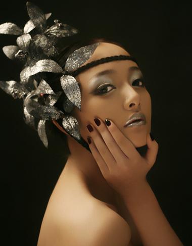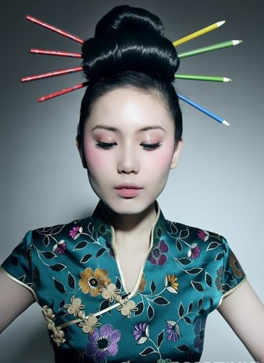 绝世美伦美艳的另类彩妆,创意无限的造型让人眼前一亮。头上插着对称的彩色笔,淡雅的粉色腮红似乎很有中国风特色。