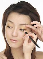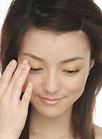 Step2:用手抹一些金色眼影紧贴着睫毛根部从内眼角向外眼角方向涂,用剩余的眼影上移到眉头部分水平向眉尾涂抹。