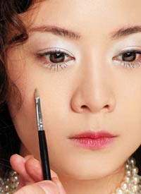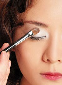 Step2:白色眼影贴近眼皮向上分层涂抹,扁头眼影刷沾银色眼影粉扫在眼角部分提亮;