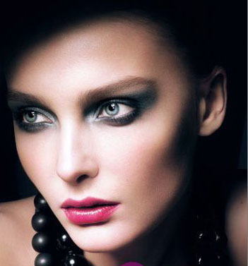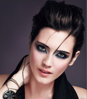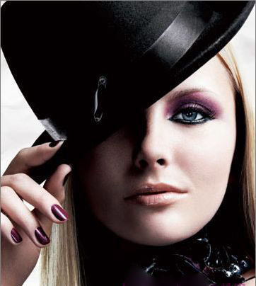 妆容描述:甜美妆容再次谢幕,各色烟熏大行其道。无瑕的肌肤底妆 和裸唇质感让眼部大胆的深紫艳彩成为妆容的灵魂所在,再配以浓重的上下眼线 ,贵族朋克式的颓废和性感展露无遗。