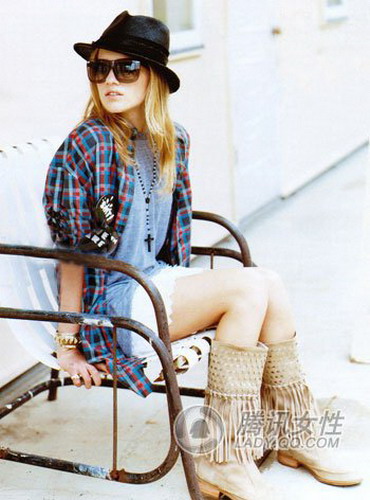 除了淑女田园外,流浪和不羁更是一种专属于秋日的浪漫情调。牛仔风情的格子衬衫和流苏装饰长筒靴,彰显美国率西部风情,率性的装扮中融入女性味十足的类似短裙,Mix出独具特色的“燃情岁月”式浪漫。