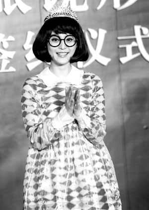 范冰冰昨天的造型和以往大不相同,有点土气的假发、复古的裙式上衣,鼻梁上还架着一副无镜片的黑框大眼镜。主持人认为这是“哈利·波特”的范儿,而范冰冰则纠正自己的造型是“阿拉蕾”(日本漫画人物),“今天心情很好,就自己设计了这个特殊造型。”俨然对自己的造型能力相当满意。