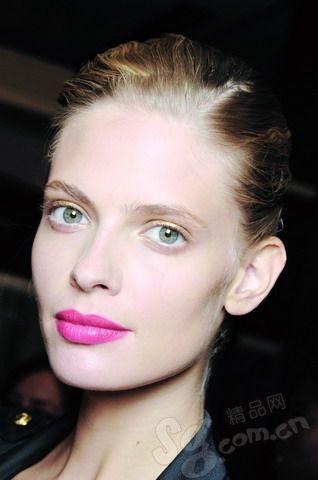 这个眼妆乍看平铺直叙,但闭眼时能看出其实是三种颜色的搭配。黑色眼线紧贴睫毛根部,紫色眼影小晕,淡金色铺底,非常有心思。