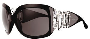 大大的宝石镶嵌在墨镜的镜架两侧,运用了奢华至极的钻石、黄金等材质,华贵的气质让人窒息。