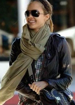 皮质的气质在不同的搭配中总可以玩出些不同的花样。杰西卡的格纹衬衫+皮衣的叠穿效果很休闲,脖子上的围巾保暖而显气质,率性傲气的皮衣元素都不复存在,让人备觉轻松和自由。墨镜和大耳环让杰西卡的气质在冷色调中显露无遗。