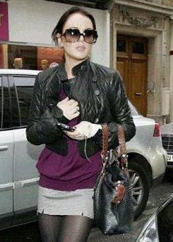 林赛罗翰的短夹克,搭配紫红色的衣服、超短裙,是帅气和性感的最佳组合。黑色丝袜和靴子拉长了腿形,茶色墨镜在此处有着画龙点睛的作用。