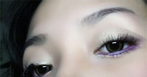 Step 6:用小号眼影刷将带闪的黑色眼影涂在眼窝后半部,将尾部延长并向上勾起。