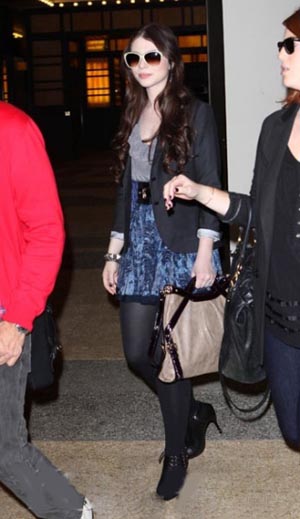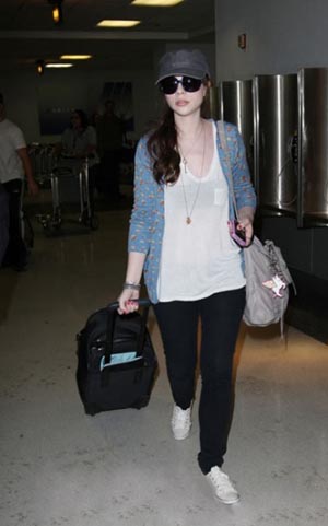 白色的半透明吊带背心与蓝色图案的针织外套简单不做作。黑色的贴身瘦腿裤与白色球鞋搭配的恰到好处。黑超加上贝雷帽是明星旅行出游最爱的低调装扮。