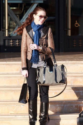 寒冷的天气黑色的瘦腿裤搭配平底靴帅气十足。咖啡色夹克与灰色针织衫层搭出与众不同的效果。一身灰黑色的装扮里蓝色的围巾是点睛之笔。