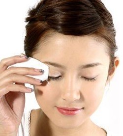 用化妆棉蘸眼部专用卸妆液,在眼部轻按5秒,让它有充分的时间溶解睫毛、眼线上的防水成分。