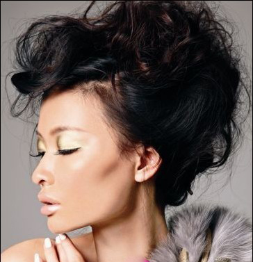 Step2 贝壳色的眼影由眼角向眼尾大面积晕染。浅浅的纯金色涂抹在整个眼窝,眼线的部分也可以用深咖啡色代替,让整体看起来更加和谐。最后涂上黑色浓密的睫毛膏 。