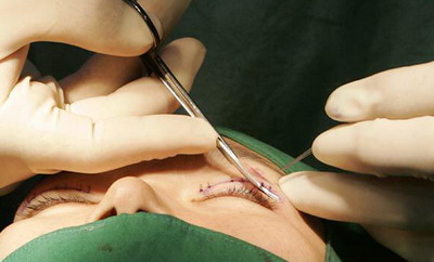 2.切开缝合法:这是一种需要开刀的方法。术前要精心设计重睑的高度,标记出上睑皮肤折痕线以及需要切除皮肤的上界等。然后按预先设计的重睑线切开,去除松弛过剩的皮肤及多余的脂肪,最后用5/0丝线间断缝合,术后7天拆线。此法的特点是双眼皮皱较深,清晰,维持时间也长久;不足是病人多少对开刀有惧怕,担心万一失败反成“疤瘌眼”。此法适应于上睑皮肤松弛、上睑皮肤较厚,以及上睑皮下脂肪较多者即俗称“水泡眼”。