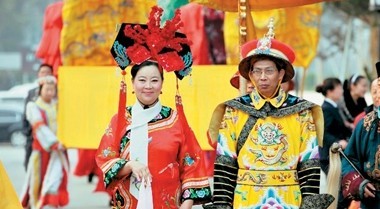20分钟的“迎圣驾”结束后,游客们纷纷上前与“皇上”、“皇后”合影留念。穿着龙袍的纪连海还不住地问身边的游客:“怎么样?像不像康熙?”他笑称,虽然当年的康熙皇帝不戴眼镜,但从流传下来的康熙皇帝的画像来看,自己的“瘦”脸型和康熙还是有几分相像之处。