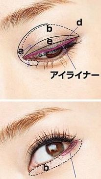 打造方法:眼球整体用b色覆盖,然后用d色涂在眼皮边缘上。中间色e和d色重叠,在顶端1/2处涂匀。用眼线填补睫毛间的空隙,在睫毛上方也画一条线。下眼皮在1/4处描画,然后再用c色覆盖。b色从眼角到眼尾涂。用a在眼球的凹陷处的黑眼珠上方和下眼角处涂抹,作为亮色眼影。最后,涂上睫毛膏就完工了。