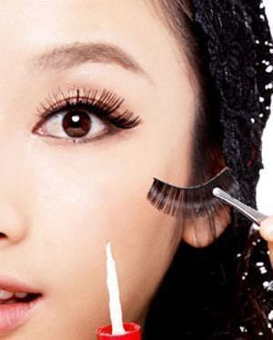 另外,亦可考虑运用假眼睫毛,来塑造出一双闪烁亮丽的眼睛。贴假眼睫毛的步骤包括:第一,把眼睫毛夹起,再轻轻涂一涂眼睫毛液。把假眼睫毛的底端贴在画眼线的位置上。所谓的画眼线位置,其实就是眼睫毛生长出来的位置。把假眼睫毛贴得愈近这个位置,效果便会愈自然。另外,所选用的夹,一般拔眉毛的钳子已适合使用。要效果更自然,似是将自己的眼睫毛和假眼睫毛混合在一起,可选用一小撮一小撮的假眼睫毛;要效果夸张点,可选用一整排的假眼睫毛。运用一整排的假眼睫毛时,注意假眼睫毛的长度,要与眼形配合。