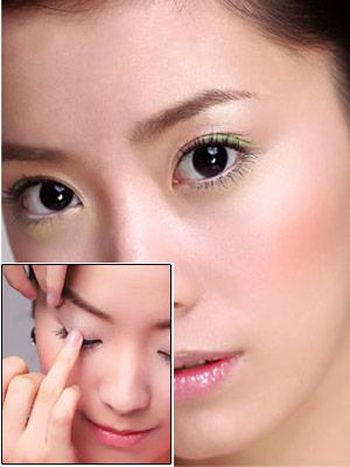 将眼尾的13处轻轻向上提起,然后用蘸有眼影的手指,贴近睫毛根部,从内眼角到外眼角,再由外眼角到内眼角,来回涂抹两次。
