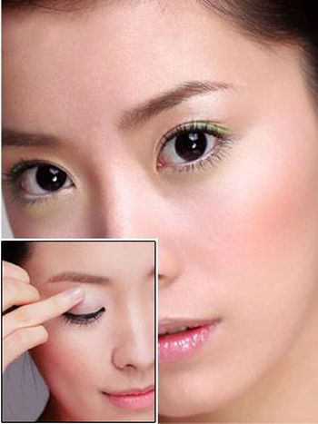 然后沿着眼球的轮廓,对上眼睑整体涂抹眼影。如果希望加强眼部立体感,可在眼球外侧的眼睑上适当加重眼影。