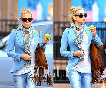 Kate显然不知道有狗仔在偷拍,所以她完全自顾自的在啃手中的那个苹果。通常,最简单的盘好的发髻看上去比较无趣,但Kate Hudson 的可不是这样。她的秘密武器?两边松散的头发让整体感觉闲适慵懒,不需要多么光洁的发髻,用手指当梳子就可以。