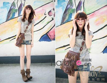 2.外出逛街的话,这款很不错,染过的刘海和眼镜的的颜色很搭,MM包包和鞋子都采用了流苏元素,整体超复古的~