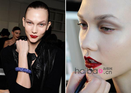 很多专家说”大红唇妆要落伍啦“”80年代的红唇不流行啦“,谁说的!?彩妆专家Charlotte Tilbury 在2010秋冬唐娜·凯伦 (Donna Karan) 秀场上竭力奉上的正是戏剧感的大红唇:“我想要嘴唇像一碗樱桃。”这款妆容的要点就是描画精确,为了避免晕妆,她先用膏状唇线描边并填色,然后用小刷子沾取口红刷在上面。