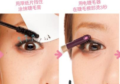 准备好厚纸片,用边角垫在睫毛刷下涂抹。扇状广泛涂抹,避免睫毛变成辣妹风(事先把厚纸片的边角剪成圆角更安全)。