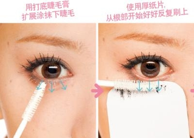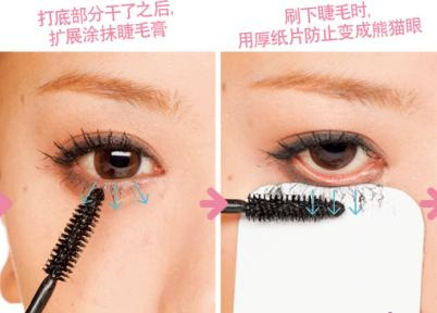 把刚才使用的厚纸片垫在刷子下,笔直向下刷。从根部开始好好涂上睫毛液防止熊猫眼。