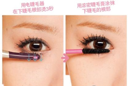 睫毛膏干掉之后,用电睫毛器在下睫毛根部烫3秒左右。用这个方法将下睫毛向下伸展固定。