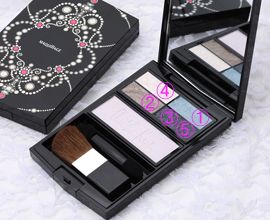 将眼影4涂在内眼角的く字部分,然后再用刷子同时取眼影盒里的四种颜色涂在脸颊上,以突显出脸线同时显有光泽。