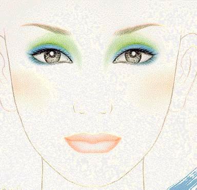 搭配色:绿色和蓝色犹如森林、大海、蓝天的组合,纯净、深远、内在、幽静、流动,眼睑上无论是由蓝色至绿色的过度,还是绿色至蓝色的过渡,一切都那么舒服自然,配合不同的粉、橙、棕等唇彩,尽现不同风格。 TIPS:先以绿色大面积晕染眼部,再于贴近眼皮的地方用眼影刷均匀刷上蓝色眼影。注意不要忽略下眼皮。