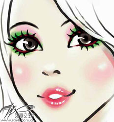 首先在上眼窝涂浅粉色,打亮整个眼部,让上眼窝处没有阴影感。上眼线和下眼线都选择咖啡色。最后,在上睫毛根部画上一层约2毫米宽的果绿色眼影。