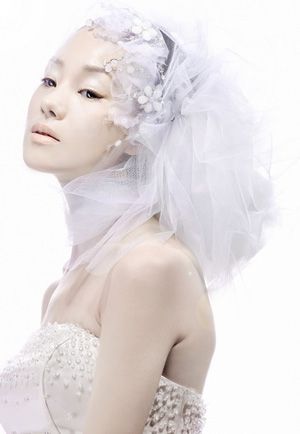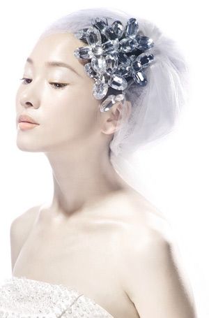 简约的纱包发设计精巧又别致、成熟、优雅的现代新娘形象。这种纱包式的打造手法是先斜盘发髻,再以发髻为中心将雪纺头纱以扩散方式包裹住整个发型,最后将水晶花簇佩戴于头纱与头发的衔接处。