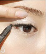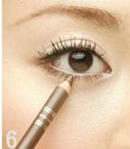为了打造出眼睛变大的效果,可以在下眼皮粘膜处用白色眼线笔描绘,这样可以以有效地将白眼球范围扩大。然后,用深棕色眼线笔将睫毛根部填满。