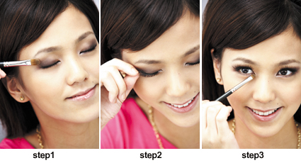 STEP1─先用眼线液描绘眼周,把睫毛中间的缝隙都补起来,眼睛立刻变有神。 STEP2─在眼窝叠上金色的眼影后,再加叠粉红色眼影,就能避免粉红色眼影造成眼皮浮肿的疑虑。 STEP3─最后用亮白色加强眼头的“ㄑ”字部位,创造如开眼头一般的大眼效果。