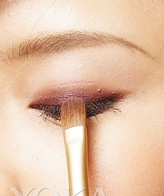 将眼影刷沾上一点点的紫色眼影,从睫毛根部轻、慢慢的以画圆弧形的方式向眼窝处晕染,使呈现自然渐层。