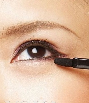 用黑色眼线笔画上下眼线,眼尾略向上勾勒,并以紫色眼影在下眼尾处加强。下眼尾的眼影切记也是要画在睫毛根部的位置,再轻轻向左右晕开。