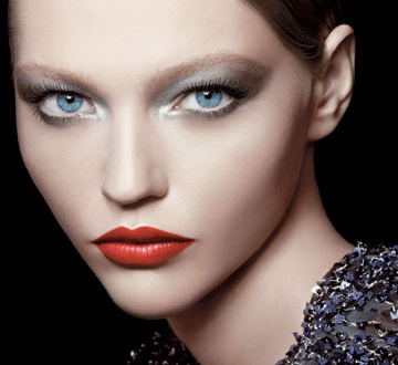 点评:优雅闪耀的银灰、明亮的深红互相映衬,在纯净无瑕的肌肤上演绎出妆容的璀璨与迷离。