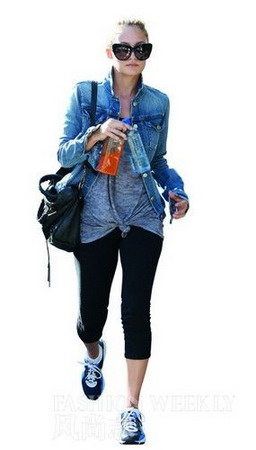 蓝色半透明长T恤和蓝色装饰运动鞋 Nicole Richie运动装看似随意,但她的蓝色半透明长T恤和蓝色装饰运动鞋上的呼应。