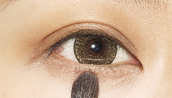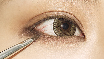 下眼睑贴着睫毛根部使用深棕色眼影,进一步修饰眼睛形状。
