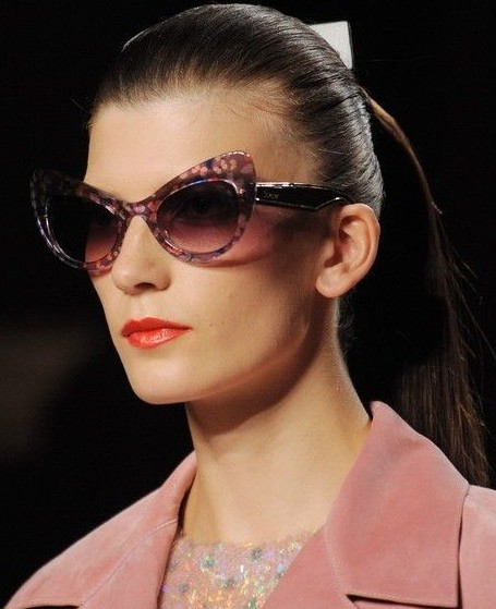 对眼镜来说另外一个重要的趋势就是这尖形镜框。来自50年代灵感的复古优雅风格,主要款式是经典的猫眼框款式,框架延伸至眉毛之上,如我们在Acne中所看到的;而修长锐利的尖状宽边眼镜则充满了未来主义的妩媚感。