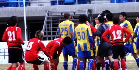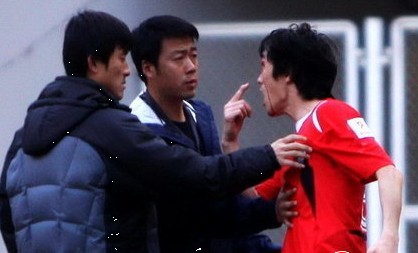 许波起身后愤怒的冲向边裁,用手指着自己的眼角示意我在流血!松江队犯规!激动地许波不断的和边裁纠缠,场面极其混乱。主裁判、延边球员和教练以及松江球员都跑了过去,两队队员也险些发生冲突。场面顿时升级,球场的武警也出动赶到了场边。