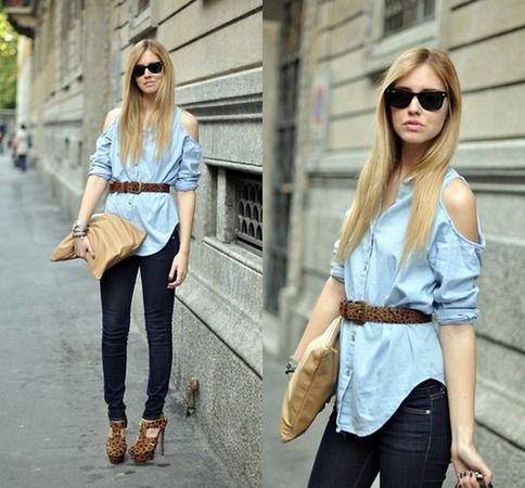 露肩设计透露性感魅力!豹纹腰带和鞋子上下统一。想要在街头一眼被秒杀黑超眼镜非它莫属!
